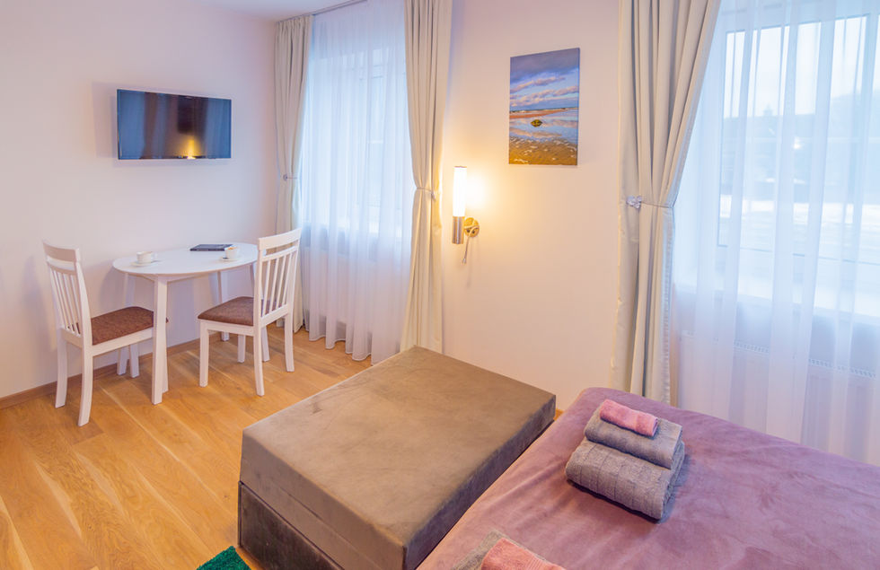 Jūsų patogumui trečiame aukšte yra vienas vienvietis kambarys, du liukso klasės dviviečiai kambariai ir dviejų kambarių apartamentai.